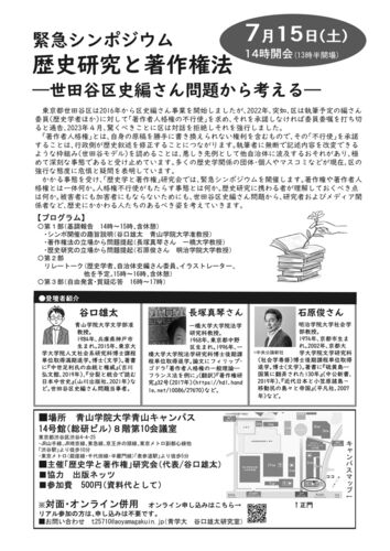 著作権、著作者人格権とは何か。著作者人格権不行使がもたらす事態とは何か。 世田谷区史編さん問題から、研究者およびメディア関係者など、歴史にかかわる人たちのあるべき姿を考えていきます。 ・日時 2023年7月15日(土曜日) 14時~17時 ・場所 青山学…